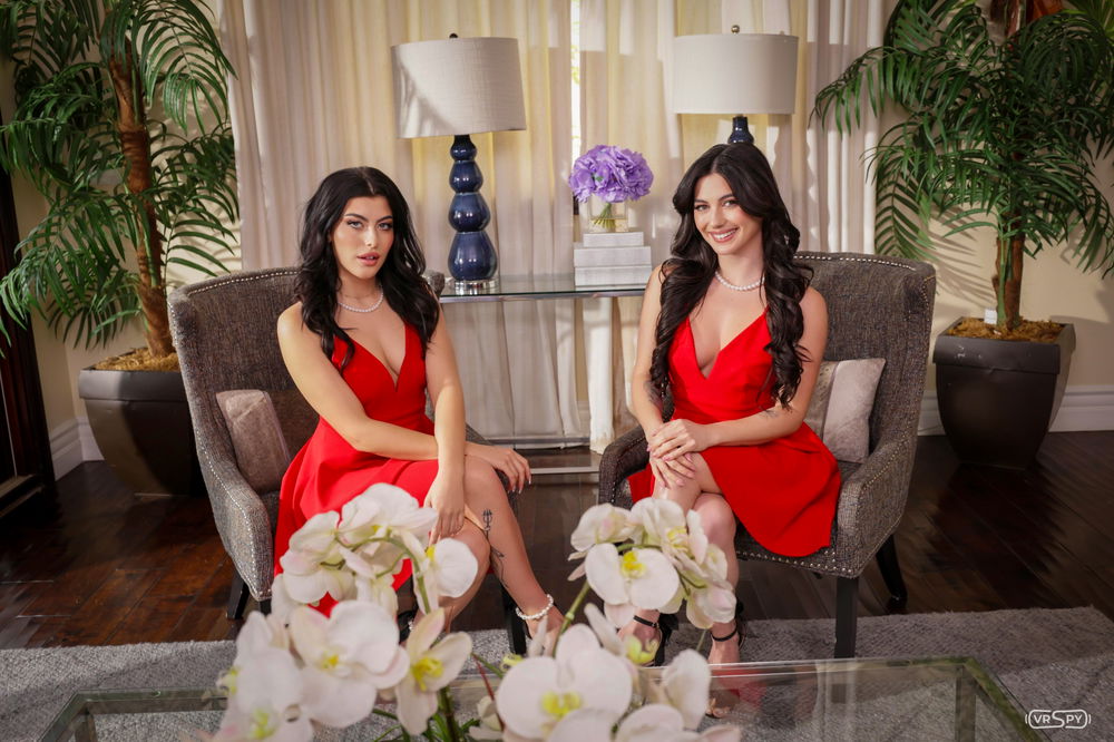 Gal returns—but she’s not alone. With her is porn star Megan Mistakes. Two stunning beauties in matching red dresses with identical hairstyles—they do look alike.